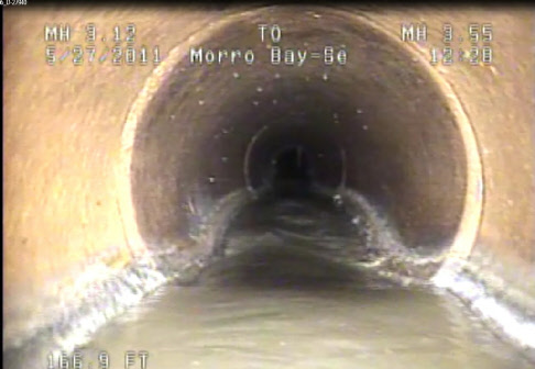 The discovery of clear evidence of the presence of sewage in the municipal wells is not surprising. The following images, from video inspections of the Main Street trunk line, show damage that is the rule, not the exception, for that segment of the collection system – considered by resident researchers to be the source of most, or perhaps all of the sewage contaminating the Morro Basin municipal wells.