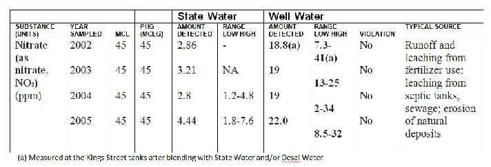 The nitrate levels reported in the years 2002 through 2005 differed radically from the actual levels recorded in the well test data sent to the CDPH. The following table gives the specific nitrate data included in the 2002 -