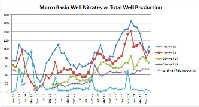 If the nitrates were from fertilizer from the Morro Valley then, since all the wells draw their water from the same aquifer, they should have similar nitrate levels. They did not. Well 03 consistently had the highest nitrate levels followed, in order, by wells 04, 14, and 15. This order corresponds exactly to the wells’ relative distances from the sewage source, with 03 being the closest, and 15 the most distant.