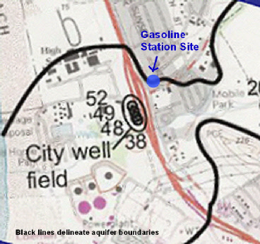 The former location of a gasoline station, which was the source of the MTBE, is shown by the beige-