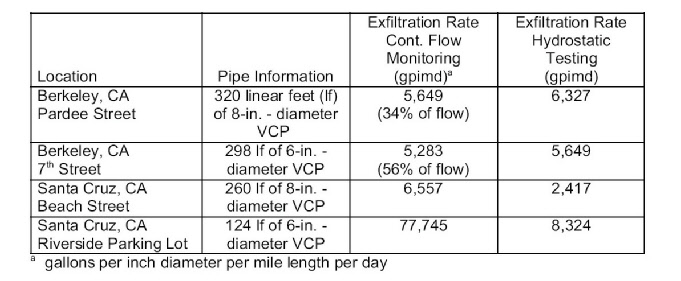 Two cities closer to Morro Bay were also discussed. The following table from the Amick and Burgess study gives exfiltration test results, using two different methodologies, for exfiltration from sewer lines in Berkeley and Santa Cruz.