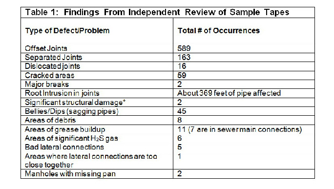 Reviewing a sample of video inspections obtained from the City, Sadowski and Bruton reviewed and logged defects identified in video inspections of approximately 8,065 feet (about 1.52 miles) of sewer lines around the City. They found that, on average, every 11.4 feet, there were sewer line defects with potential for inflow and infiltration (I&I) and/or sewage exfiltration into the soil.