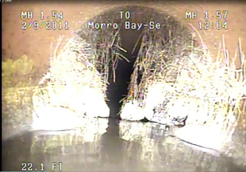 The discovery of clear evidence of the presence of sewage in the municipal wells is not surprising. The following images, from video inspections of the Main Street trunk line, show damage that is the rule, not the exception, for that segment of the collection system – considered by resident researchers to be the source of most, or perhaps all of the sewage contaminating the Morro Basin municipal wells.